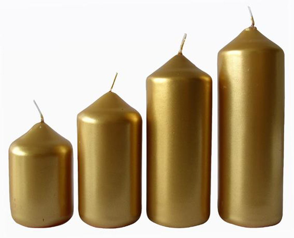 Nezapomeňte prosím dbát na bezpečnost a držte se na svíčce uvedených bezpečnostních piktogramů. Materiál parafín. Balení 4 ks. Průměr svíček je 4 cm. Výška jednotlivých svíček je: 6,5 , 8,5 , 10 a 12 cm. Barva – zlatá.