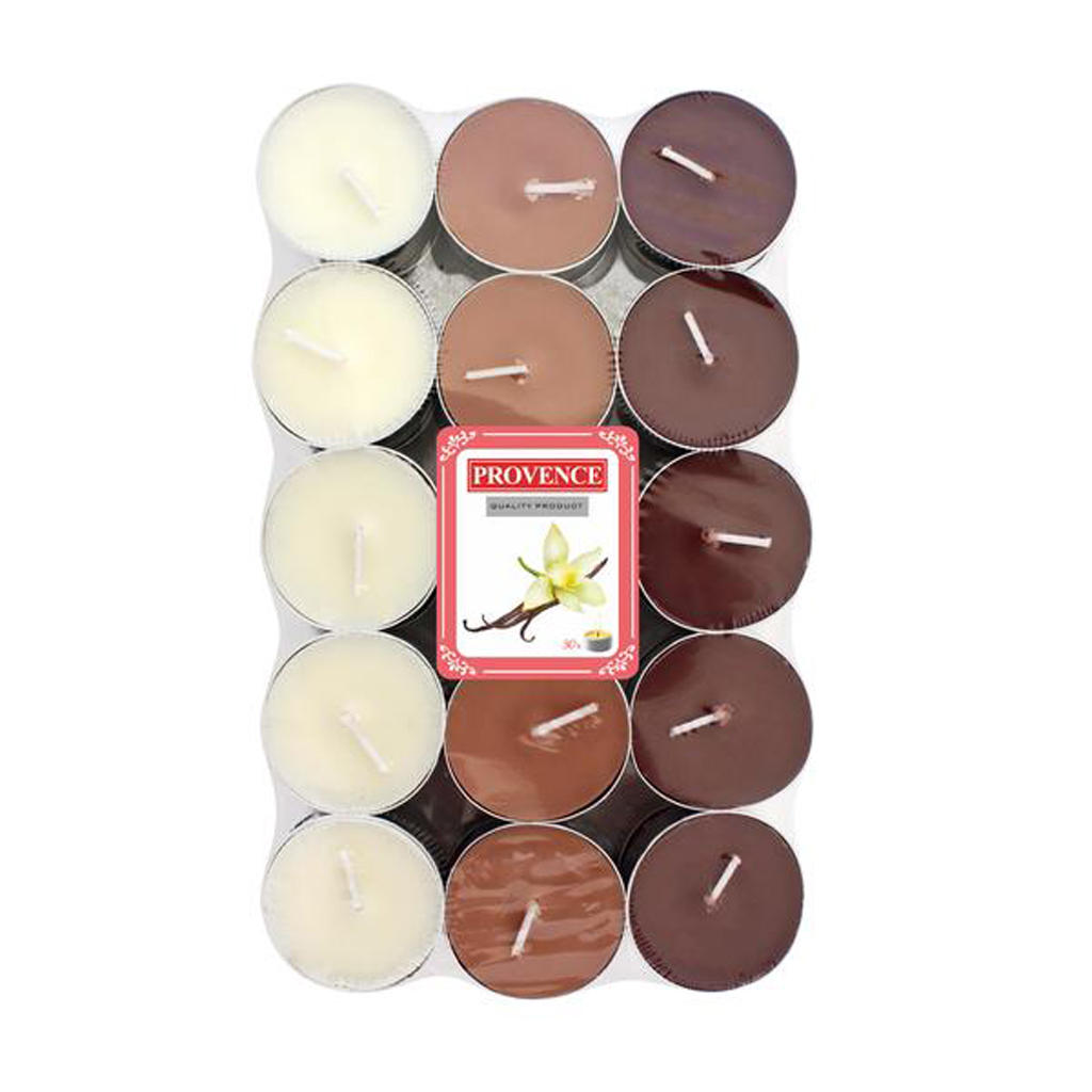 Vonná čajová svíčka PROVENCE vanilka 30ks je příjemný a přirozený zdroj světla. Zároveň zajistí krásnou vůni v místnosti a podpoří příjemnou atmosféru. Čajové svíčky jsou ideální na přípravu ozdobných věnců, náplně do svícnů a lamp.