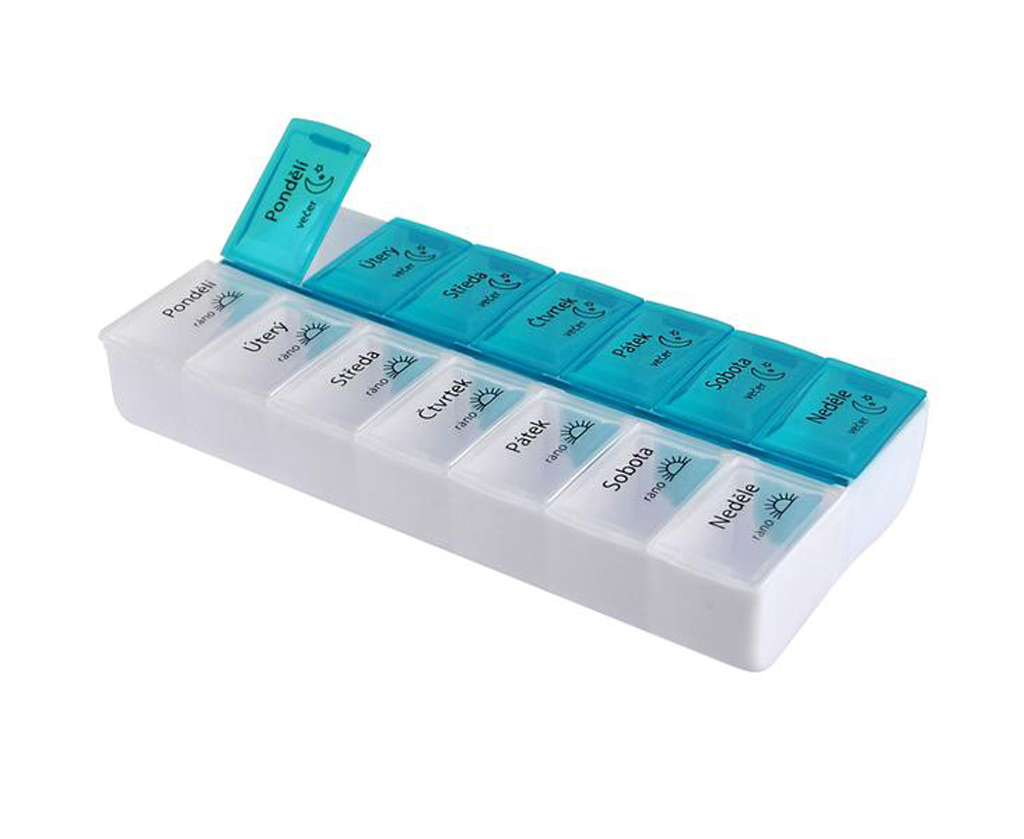 plastová krabička na léky na celý týden. Sedmidenní dávkovač slouží ke spolehlivému a přehlednému uspořádání a dávkování léků i potravinových doplňků. Je značen symbolem zobrazujícím denní dobu (vycházející slunce) – Ráno / (měsíc) – Večer. Části dne jsou barevně odlišené pro lepší přehlednost. Každá část dne se otevírá samostatně. Materiál – plast. Rozměry: 18 x 9,5 x 3 cm