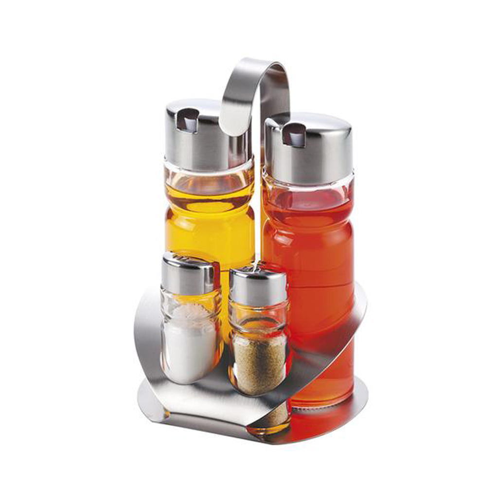 Menážka patří mezi klasické pomocníky v domácnostech a v restauracích. Skládá ze slánky, pepřenky a ze dvou nádob na olej s nalévátkem. Vše je uchyceno na stojánku s praktickým ouškem na snadné přenášení. Materiál – nerez, sklo. Průměr menážky – 4,5 cm. Rozměry – 4,5 x 15,5 cm.