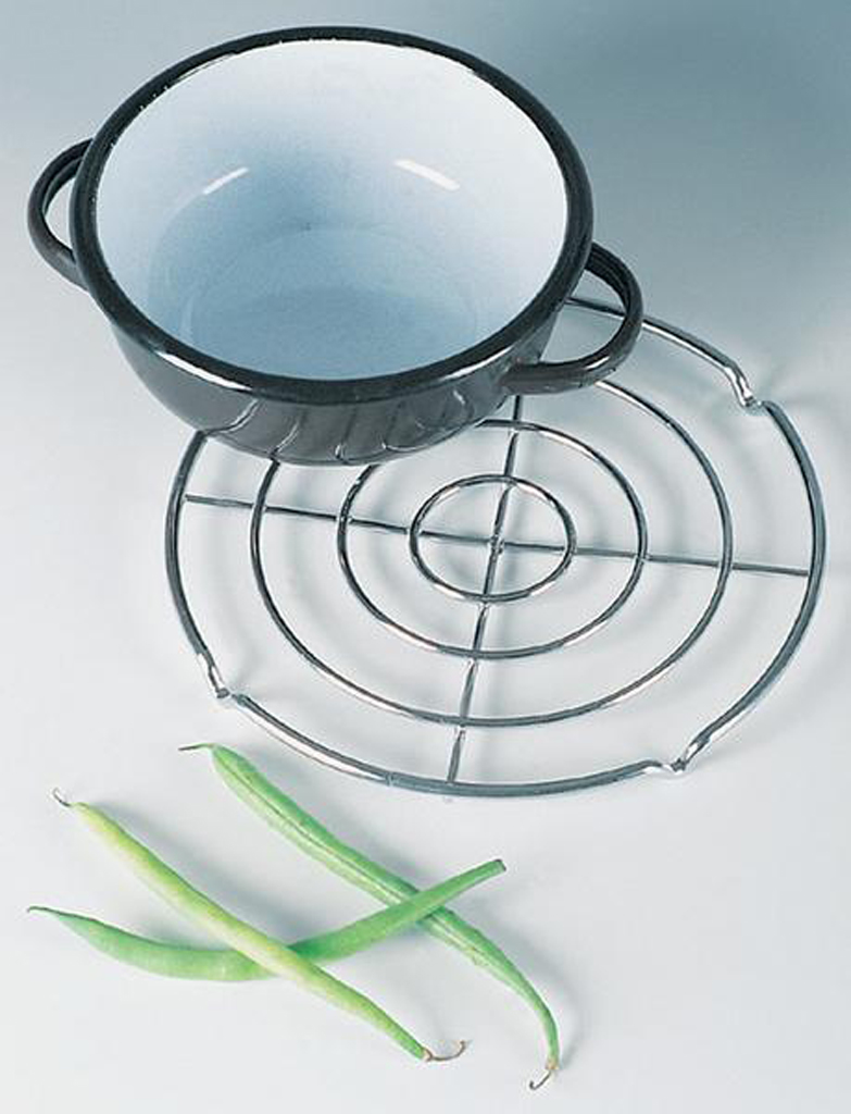 Podložka pod hrnec – kulatá, na odkládání hrnců i kastrolů všech velikostí, také je vhodná k odložení při vaření i servírování. Vyrobená z pochromovaného kovu. Rozměry podložky – 19,7 x 0,9 cm.