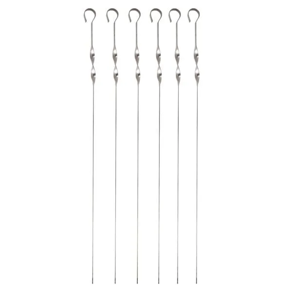 Ploché grilovací jehlice s očkem – 6 ks. Sada špízových jehlic s dostatečnou délkou 60 cm, která umožňuje bezpečnou manipulaci, ochrání Vás před žárem a umožní ugrilovat najednou velké množství potravin. Špízové jehly jsou ideální pro grilování zeleniny a masa. Očko usnadňuje otáčení jehlic při grilování. Materiál – nerez.