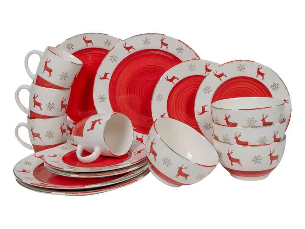 Krásná vánoční keramická jídelní sada 16 ks – Sob přináší do svátečního stolování pohodu, eleganci i hravý detail. Obsahuje 4 jídelní talíře, 4 dezertní talíře, 4 misky a 4 hrnky, které společně tvoří laděný celek pro čtyři osoby. Každý kousek je zdoben jemným motivem soba a zimních detailů, díky nimž se na stole rozzáří pravá vánoční atmosféra. Sada je vyrobena z kvalitní glazované keramiky, která je odolná, snadno se čistí a je vhodná do myčky i mikrovlnné trouby. Praktická, přitom elegantní – ideální pro slavnostní večeři i klidné zimní snídaně s rodinou.