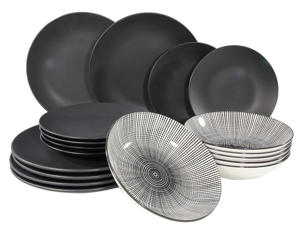 Jídelní talířová sada je nezbytnou součástí každé domácnosti. souprava NAGANO, která je vyrobena z vysoce kvalitní keramiky s vrstvou glazury, vyniká svou originalitou a jedinečností každého kusu. Sada talířů TAVOLA NAGANO obsahuje 6 mělkých, 6 dezertních a 6 hlubokých talířů. Talíře už nemusí být jen čistě bílé, proč nezkusit něco nového, nevšedního? Moderní kombinace černé a bílé bezpochyby vyladí každý stůl. Všechny talíře jsou vhodné do myčky na nádobí i do mikrovlnné trouby