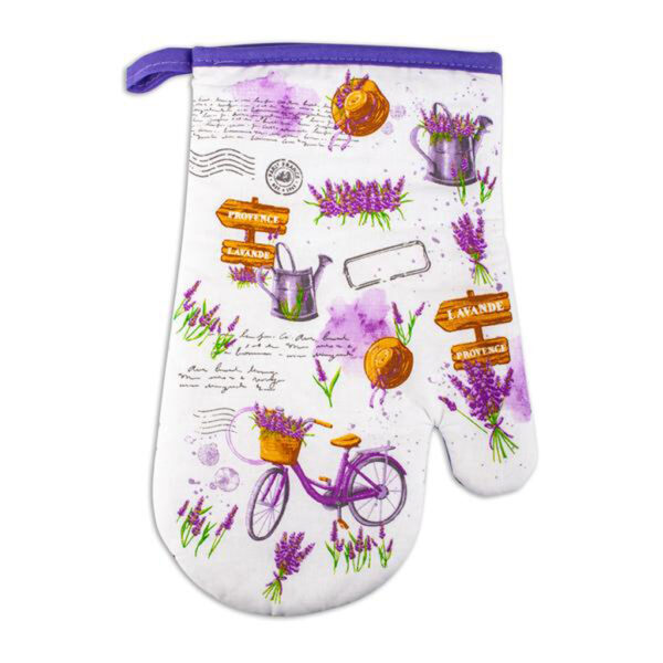 Kuchyňská rukavice TORO s motivem levandule. Praktická rukavice chňapka ochrání před popálením ruky a může sloužit i jako podložka pod horké nádobí nebo plech na pečení. Kuchařská rukavice má malé poutko pro jednoduché zavěšení, můžete jí mít stále po ruce