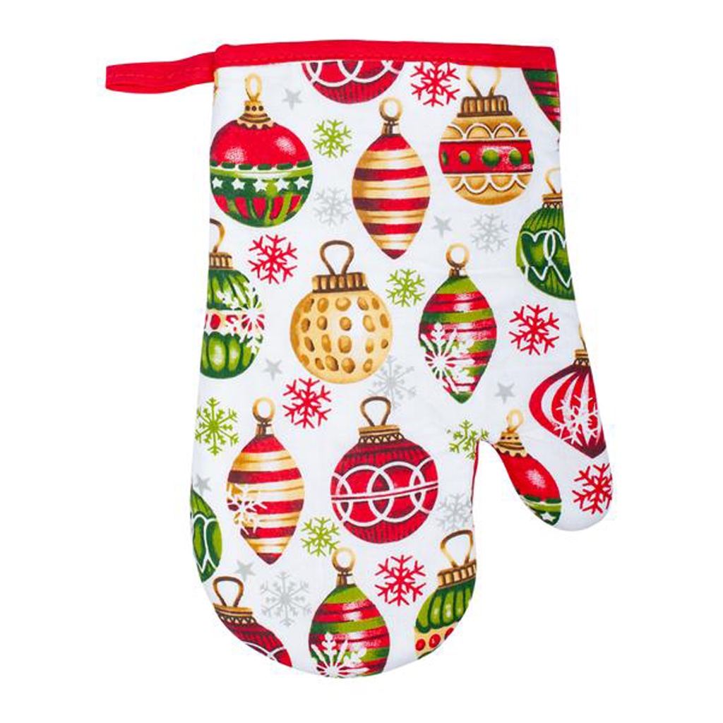 Kuchyňská rukavice TORO s originálním motivem vánočních ozdob. Praktická rukavice chňapka ochrání před popálením ruky a může sloužit i jako podložka pod horké nádobí nebo plech na pečení. Kuchařská rukavice má malé poutko pro jednoduché zavěšení, můžete jí mít stále po ruce