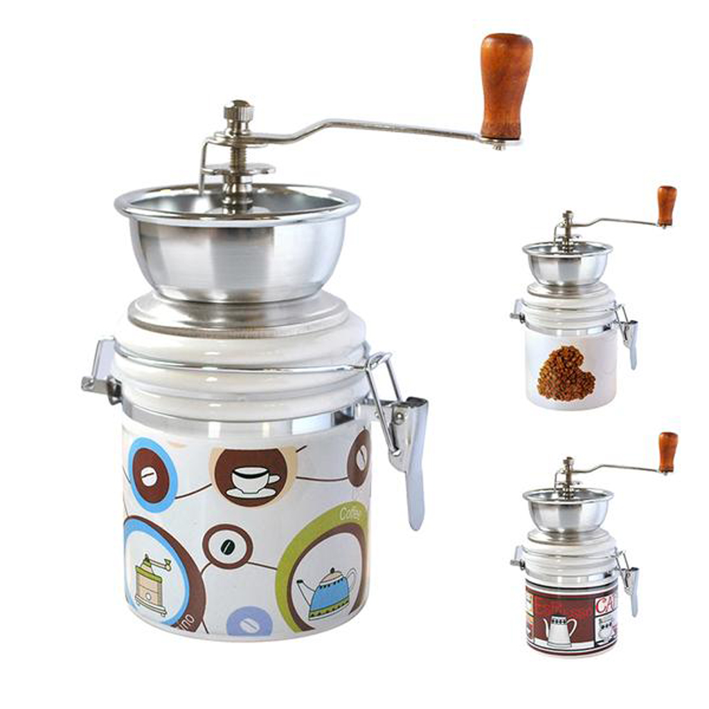 ruční mlýnek s moderním motivem kávy s uzavíratelným kontejnerem. Tělo mlýnku, které má patentní uzávěr je vyrobeno z porcelánu, mlecí mechanismus z nerezových slitin a ergonomická rukojeť ze dřeva. Lze nastavovat libovolnou hrubost mletí. Mlýnek je vhodný také jako dekorace. Rozměry mlýnku – 8,5 x 8,5 x 17 cm.