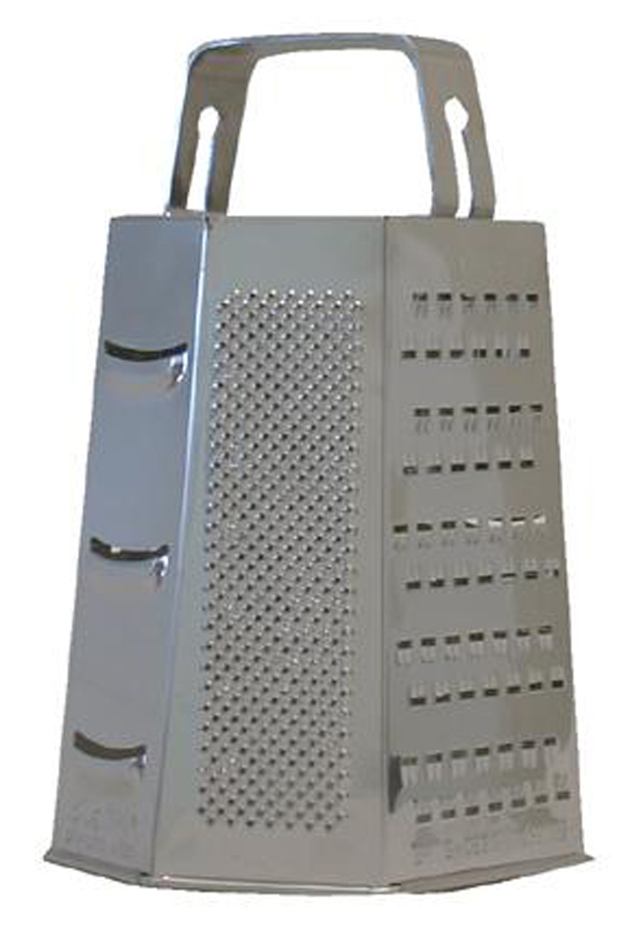 Šestihranné struhadlo se základními funkcemi strouhání a pevným držadlem. Lze strouhat na jemno, na hrubo a na plátky. Materiál – nerez. Rozměry – 9,5 x 22 cm.