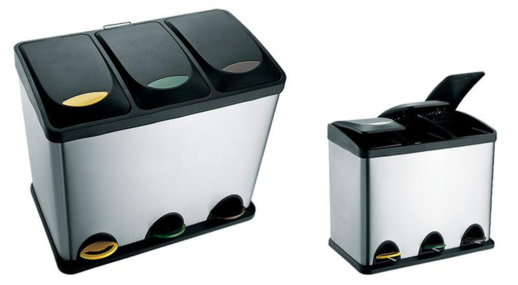 Nerezový nášlapný odpadkový koš na tříděný odpad TORO 24 litrů. Nerezový odpadkový koš TORO vyniká svým jednoduchým designem, samostatně stojící nerezový koš krásně zapadne do stylového vybavení domácnosti nebo kanceláře. Tři vyjímatelné nádoby, každá o objemu 8 litrů z pevného tvrzeného plastu s madlem pro snadnější manipulaci. Nášlapné pedály a víko jsou barevně odlišené podle norem EU.