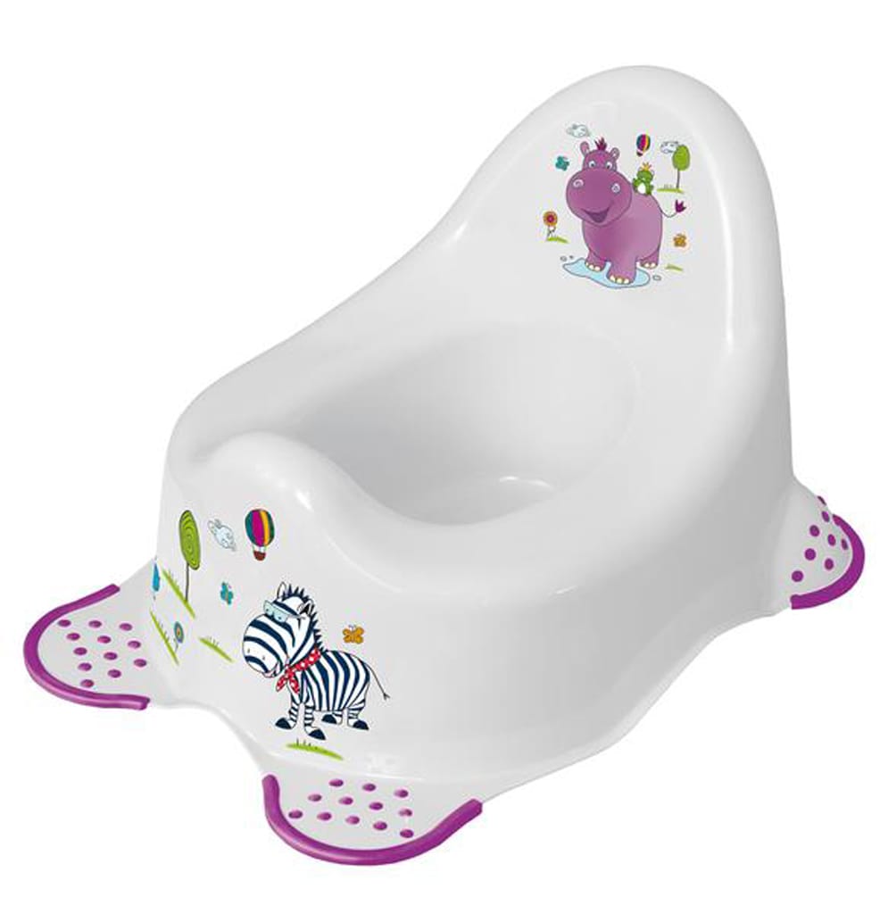 nočník dětský s anatomickým tvarováním a vysokou opěrkou, která poskytuje dítěti pohodlné posazení. Zvýšený tvar nočníku zabraňuje vyšplíchnutí obsahu nočníku. nočník je maximálně stabilní díky širokým podnožkám. spodní strana s protiskluzovou úpravou pro větší bezpečí Vašeho dítěte. Motiv hrošíka, barva bílá. Objem 1 l, rozměry – 34,5 x 26 x 24 cm.