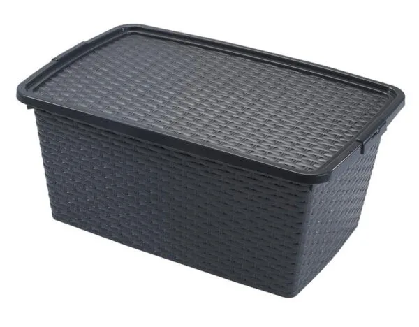Plastový úložný košík HEIDRUN Rattan 40l litrů s praktickým víkem. Kvalitní plastový box je skvělý pomocník na uchování, skladování a ochranu drobností, oblečení, nebo hraček. Úložná krabice ochrání vše před nečistotami, prachem, vlhkem a poškozením. Košík s víkem se bude hodit do koupelny, ložnice, do dětského pokojíčku, ale své velké uplatnění najde i v garáži nebo dílně. Jedinečný a originální design ratanu. Neprůhledné boxy ukryjí a ochrání věci před slunečním svitem