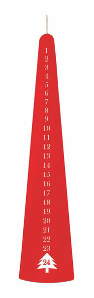 svíčka kónická adventní o délce 25 cm navodí ve Vašem domově příjemnou atmosféru. Na svíčce jsou uvedeny kalendářní dny, které mizí postupným hořením svíčky. Nezapomeňte prosím dbát na svou bezpečnost a držte se na svíčce uvedených bezpečnostních piktogramů. Materiál parafín. Barva červená.