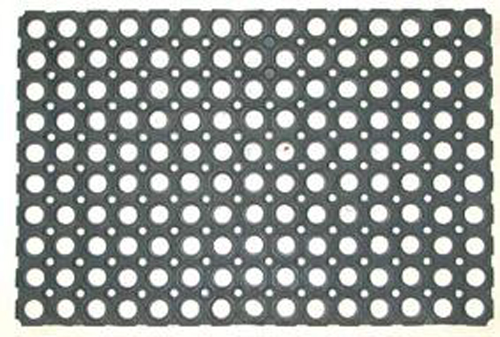 Hladká gumová rohožka. Praktická rohožka před dveře na čištění obuvi. Stabilní gumová rohožka s kulatými otvory při čištění obuvi po podlaze neklouže. Jednoduché čištění. Černá barva. Rozměry rohožky 40 x 60 cm.