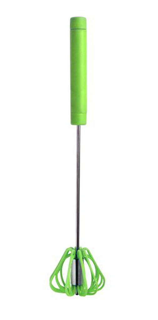Praktický šlehač na vejce – metlička. Mačkáním rukojeti nahoru a dolů roztáčíte metličku. Je ideální na mixování vajíček, jíšky, zahušťování směsí, řídké těsta, šlehačku a jiné krémy. Rozměry – 25,5 x 5,5 cm. Assort barev.
