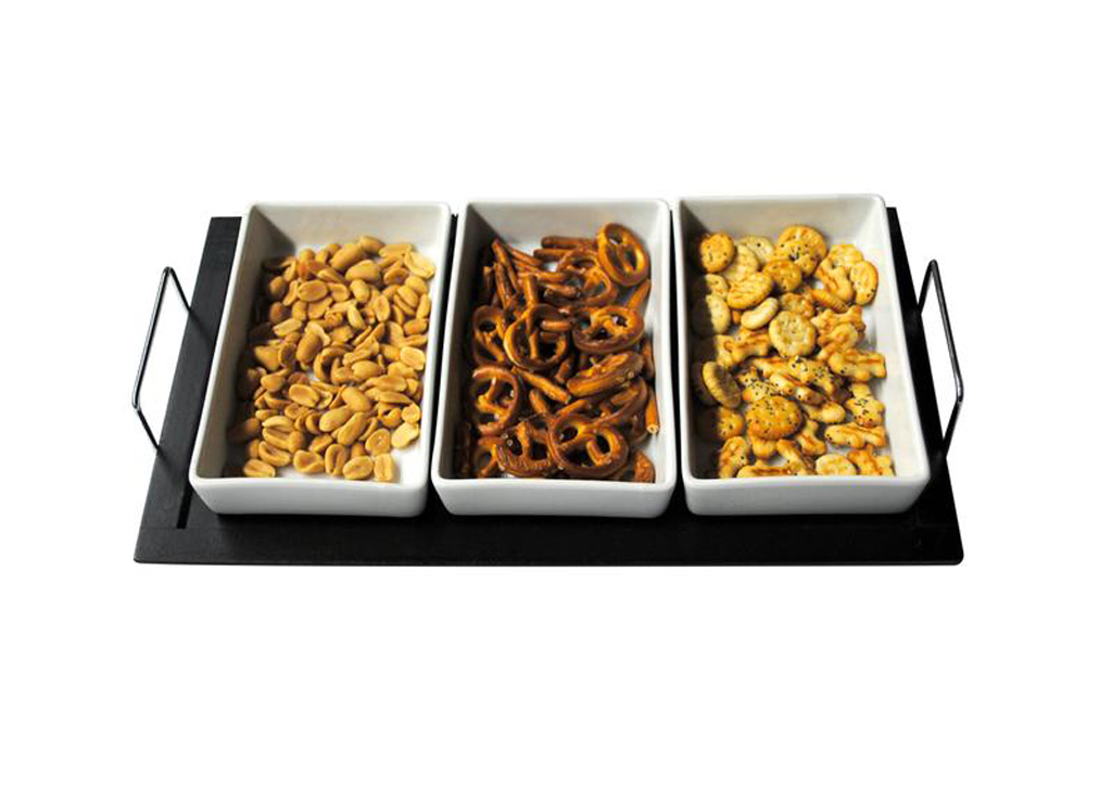 Velmi oblíbená sada tří misek na dřevěném podnose je velmi praktická při servírování různých pokrmů, nerezová ouška po stranách podnosu zajišťují lehkou manipulaci. Misky jsou vhodné do myčky na nádobí, podnos je snadno omyvatelný, stačí přetřít vlhkým hadříkem. Objem misek je 200 ml. Rozměry misky – 9,4 x 3 x 15,3 cm. Rozměr podnosu – 33 x 19 cm.