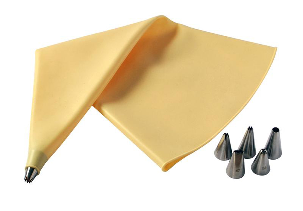 silikonový zdobící sáček s výměnnými tryskami různých velikostí a tvarů. Zdobící sáček je vhodný ke zdobení, dortů a jiných sladkých moučníků. Silikon je lehce omyvatelný, vhodný do myčky. Materiál – silikon, nerez. Šířka 21,5 cm, výška 39 cm.