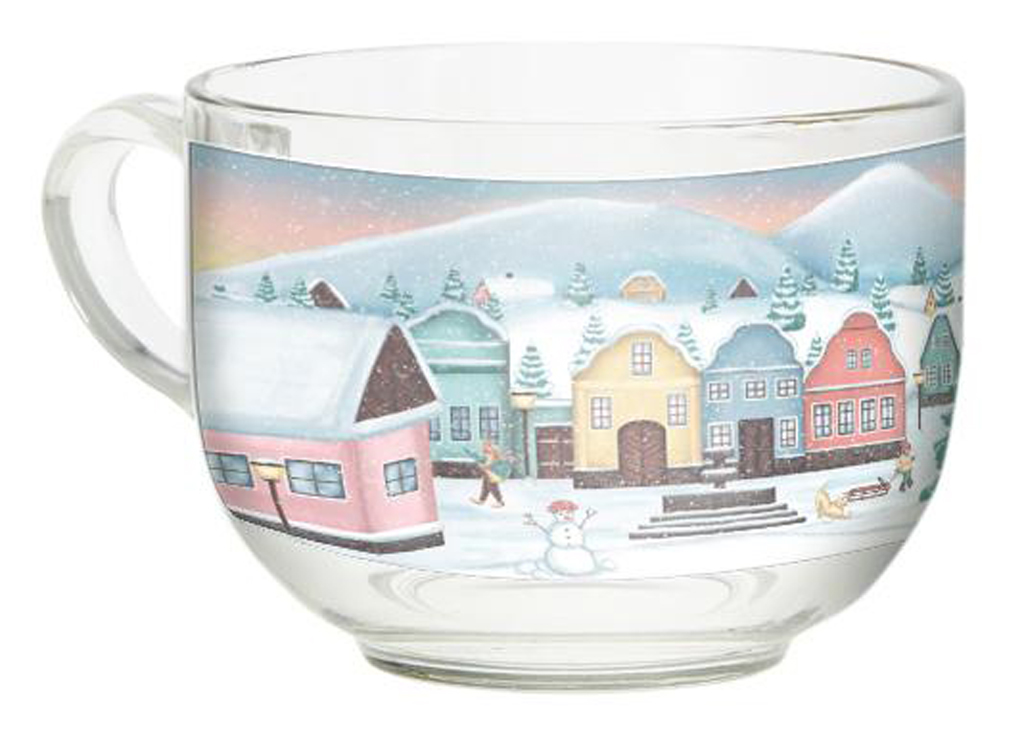 Skleněný hrneček TORO o objemu 400ml s originálním motivem zimní vesničky. Kvalitně a precizně provedený potisk zasněžené vesničky dodá nápojům sváteční nádech. Velikost hrnku je ideální na podávání uvařeného čaje, větší kávy nebo ostřejších nápojů na zahřátí.