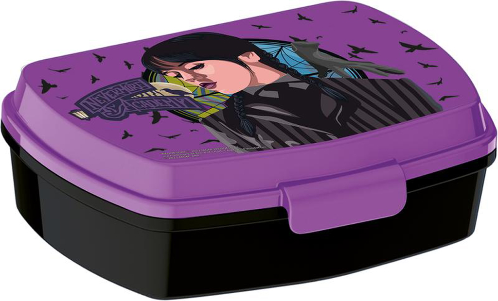 Plastový box s pevným klipem na uzavření využijete na svačinu do školy, na výletě, na piknik i do auta. Dostatečně prostorná krabička bezpečně uchová sendviče, toast i nakrájené ovoce a zároveň ochrání tašku nebo batoh před znečištěním od jídla. Použitý odolný plast činí krabičku téměř nerozbitnou. Atraktivní design Wednesday nadchne všechny milovníky tradičních malovaných Disney hrdinů
