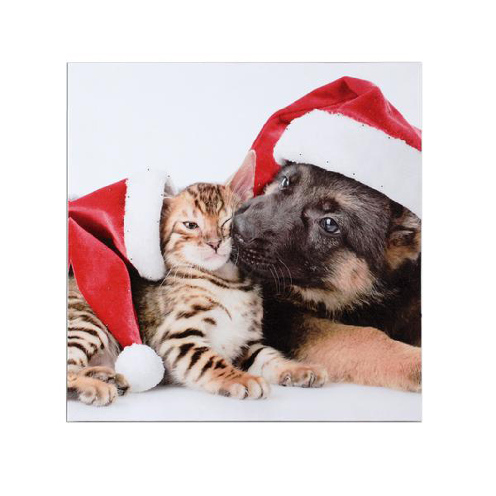 Moderní, dekorativní svítící obraz (1 LED) vyzdobí a zútulní Váš interiér. Materiál – tisk na plátně, dřevěný rám, velikost obrazu – 30 x 30 cm. potisk „KOČKA A PES“.