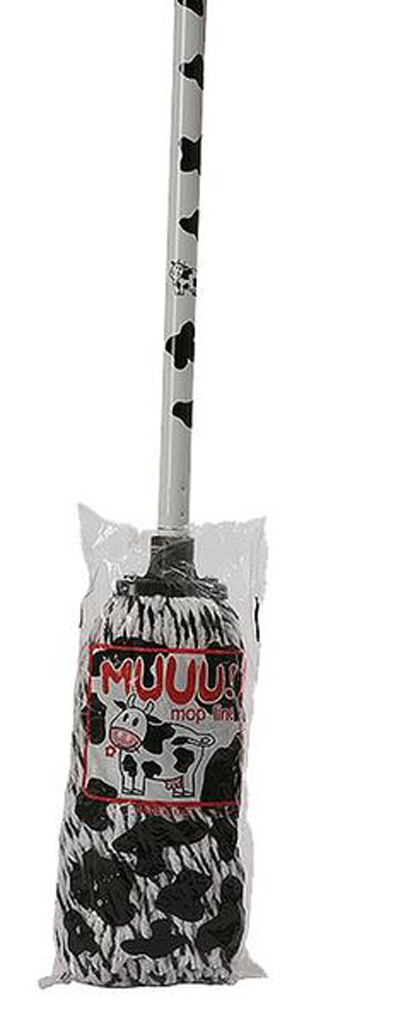 Mop s násadou. Mop je vyroben z bavlny, která zabezpečí vysokou savost. Násada je kovová, potažená plastem a lze ji za oko zavěsit. Rozměry – 10 x 7,5 cm. Vzorováno motivem „Kráva“.