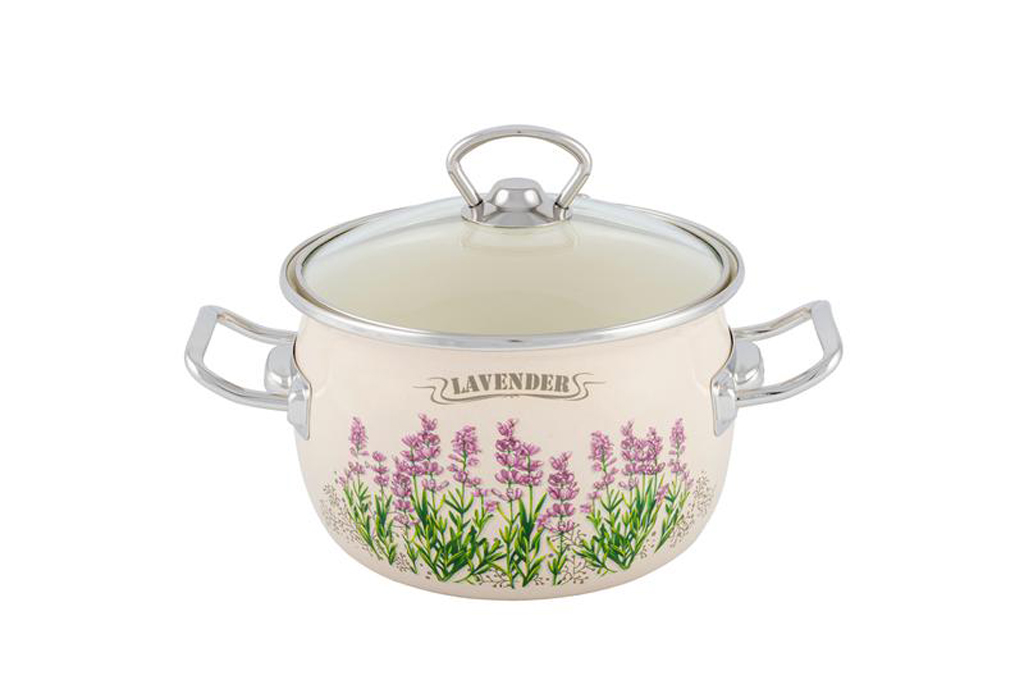 Buclatý hrnec se skleněnou pokličkou smalt TORO je vhodný ke každodennímu použití. Lze jej mýt v myčce na nádobí a je vhodný pro plynové, elektrické sporáky a indukci. Objem 3,5 l, motiv – levandule.