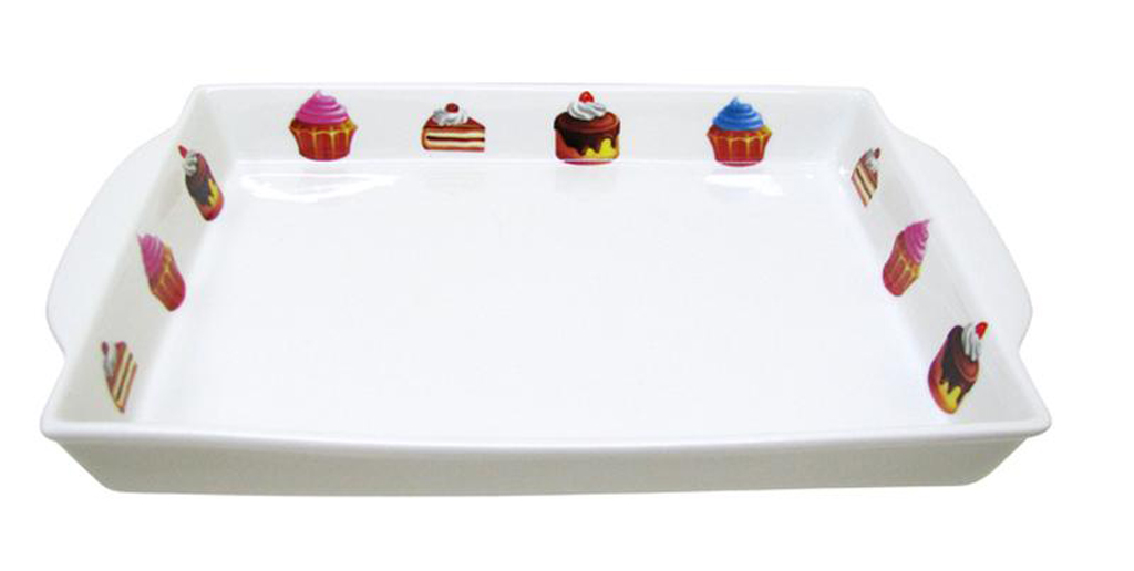 Tác obdélníkový má velmi pěkný moderní design s dekorem dortíky, je velmi oblíbený díky svému tvaru a vzhledu. Je vyroben z keramického materiálu, je snadno omyvatelný a vhodný na servírování různých pormů nebo cukroví.