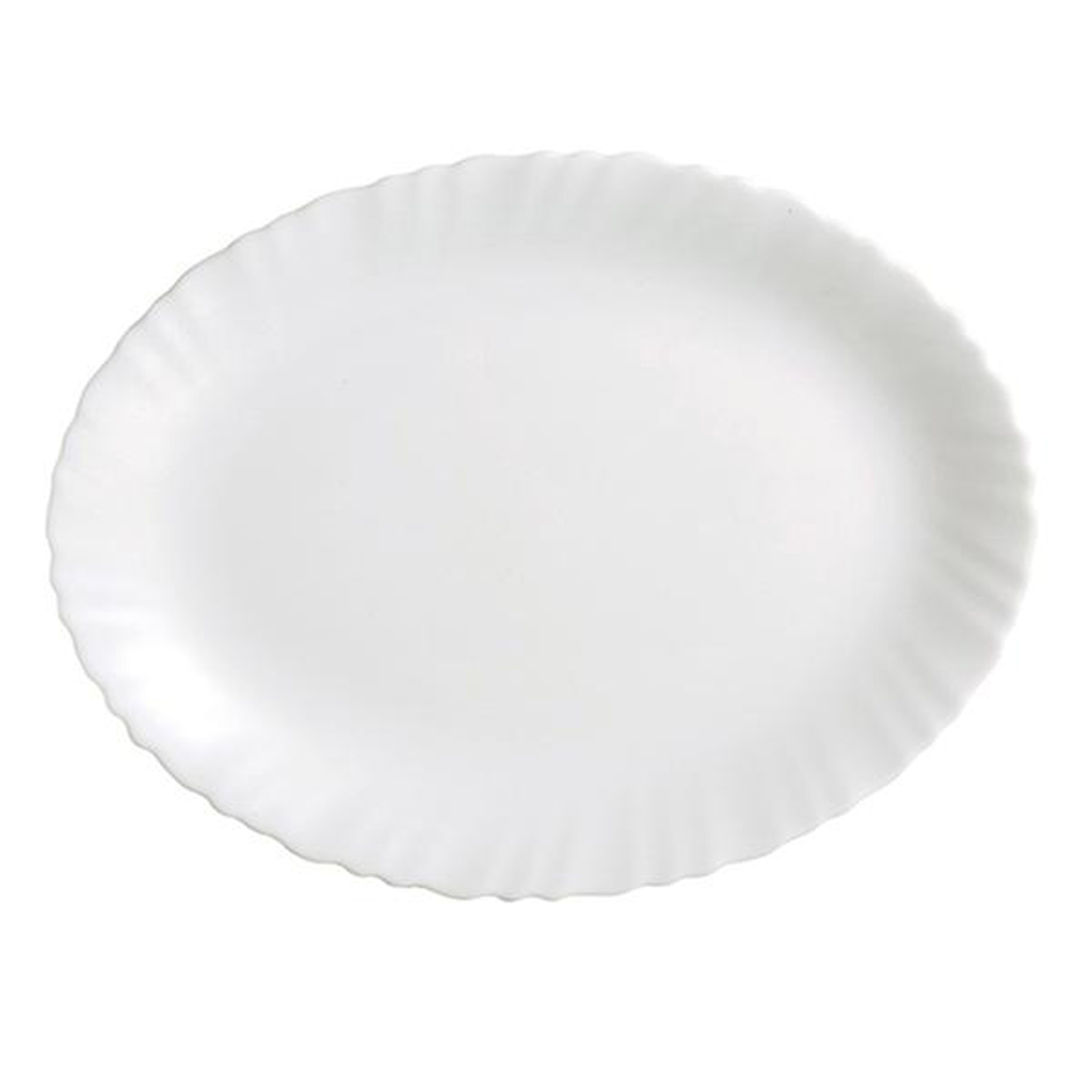 jídelní oválný talíř „Titan“ je krásný moderní talíř vyroben z opálového skla. Opálové sklo je tvrzené sklo, nahrazuje porcelán a je těžko rozbitné, velice oblíbené. Šířka talíře je 36 cm. Jemně vlnitý okraj. Barva bílá.