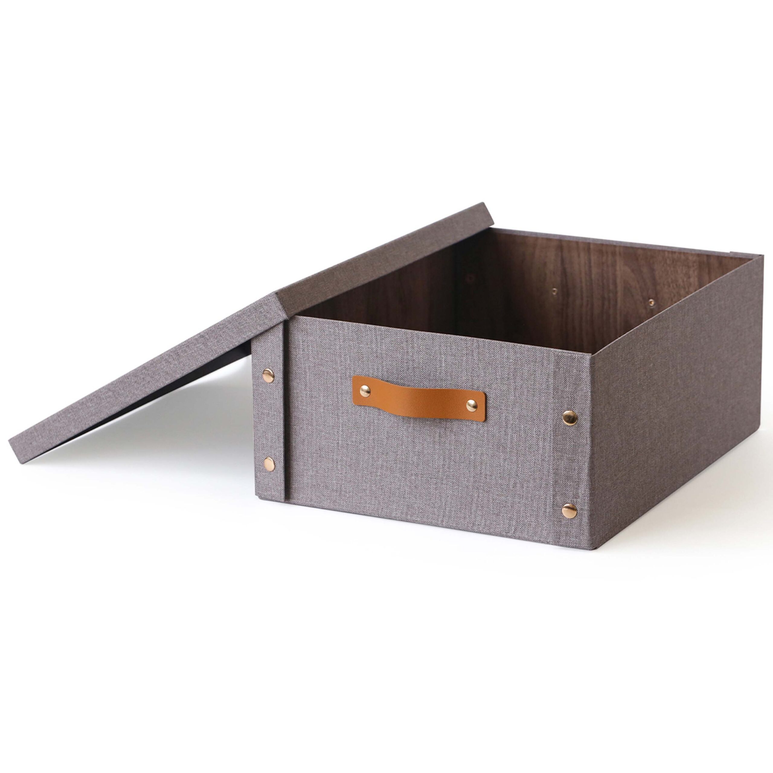 Krabici doporučujeme používat především na suché a lehčí předměty, aby si kartonová konstrukce zachovala pevný tvar a dlouhou životnost. Vnější textilní povrch lze snadno otřít vlhkým hadříkem, zatímco vnitřní papírový dekor čistěte pouze nasucho nebo mírně vlhkým hadříkem, bez použití agresivních prostředků. Díky víku zůstává uložený obsah chráněný před prachem a zároveň nepůsobí rušivě — krabice se tak skvěle hodí i do otevřených polic v obývacím pokoji nebo na viditelná místa v pracovně. Úložná kartonová skladovací krabice má velké ucho pro snadnou manipulaci. Je lehká, snadno přenositelná a díky kombinaci šedé barvy s teplým dřevěným dekorem vypadá harmonicky a elegantně.