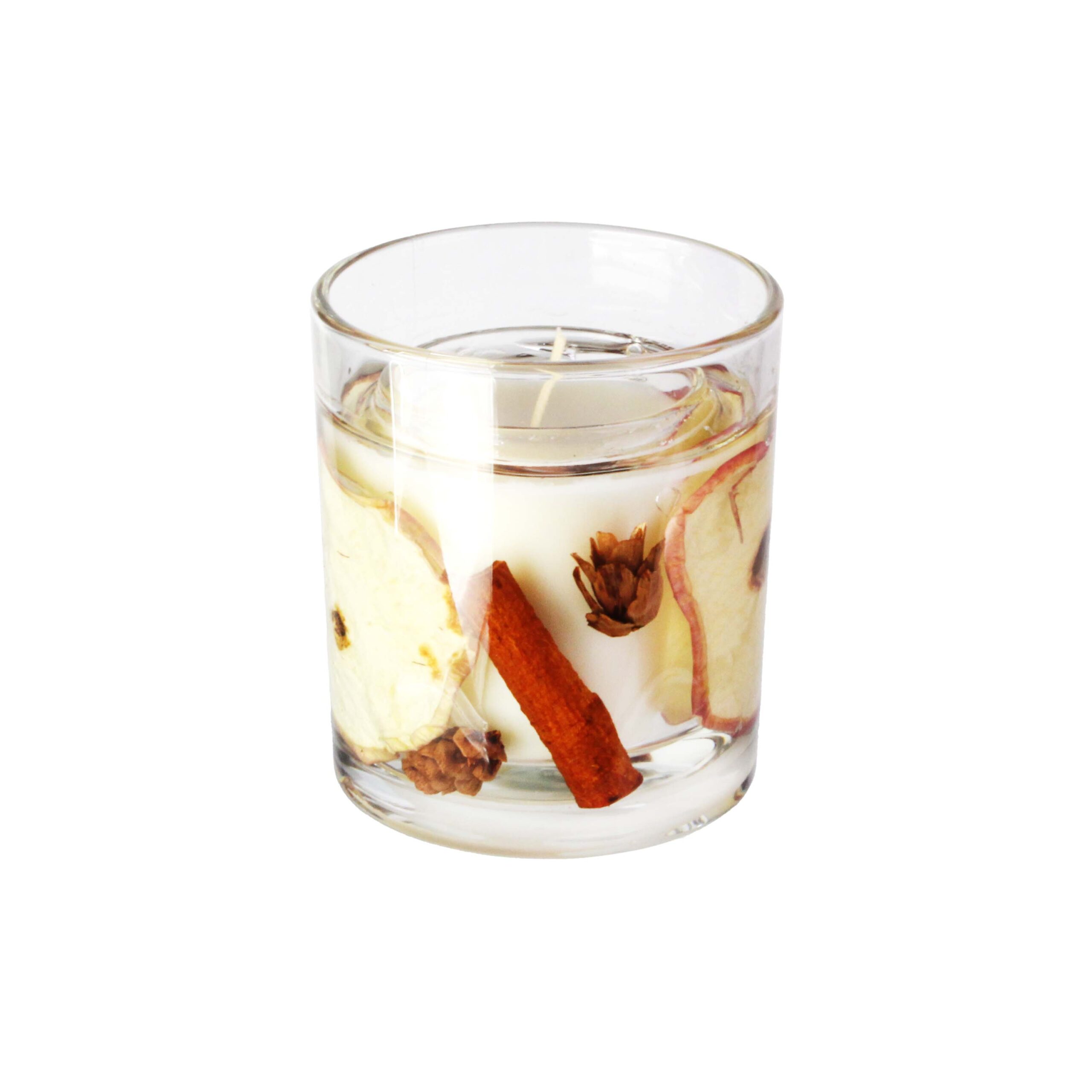 - průhledné sklo s výplní – jablko, skořice, šišky