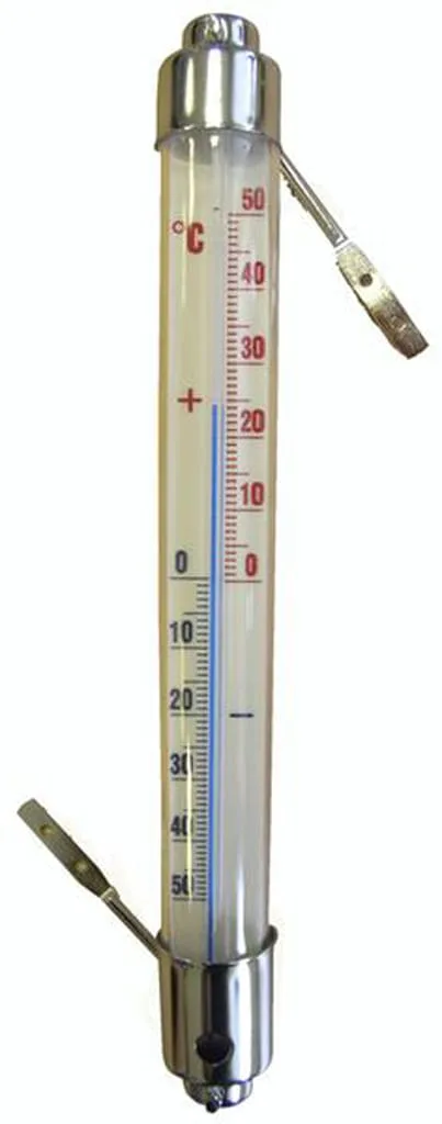 teploměr je základní pomůcka ke kontrole venkovní teploty. Lihový teploměr ve tvaru válce. Teploměr má stupnici od – 50 do + 50 °C. Teploměr je vyroben z umělé hmoty a skla a lze ho připevnit na šroubky. Rozměry teploměru – 2,1 x 20 cm.