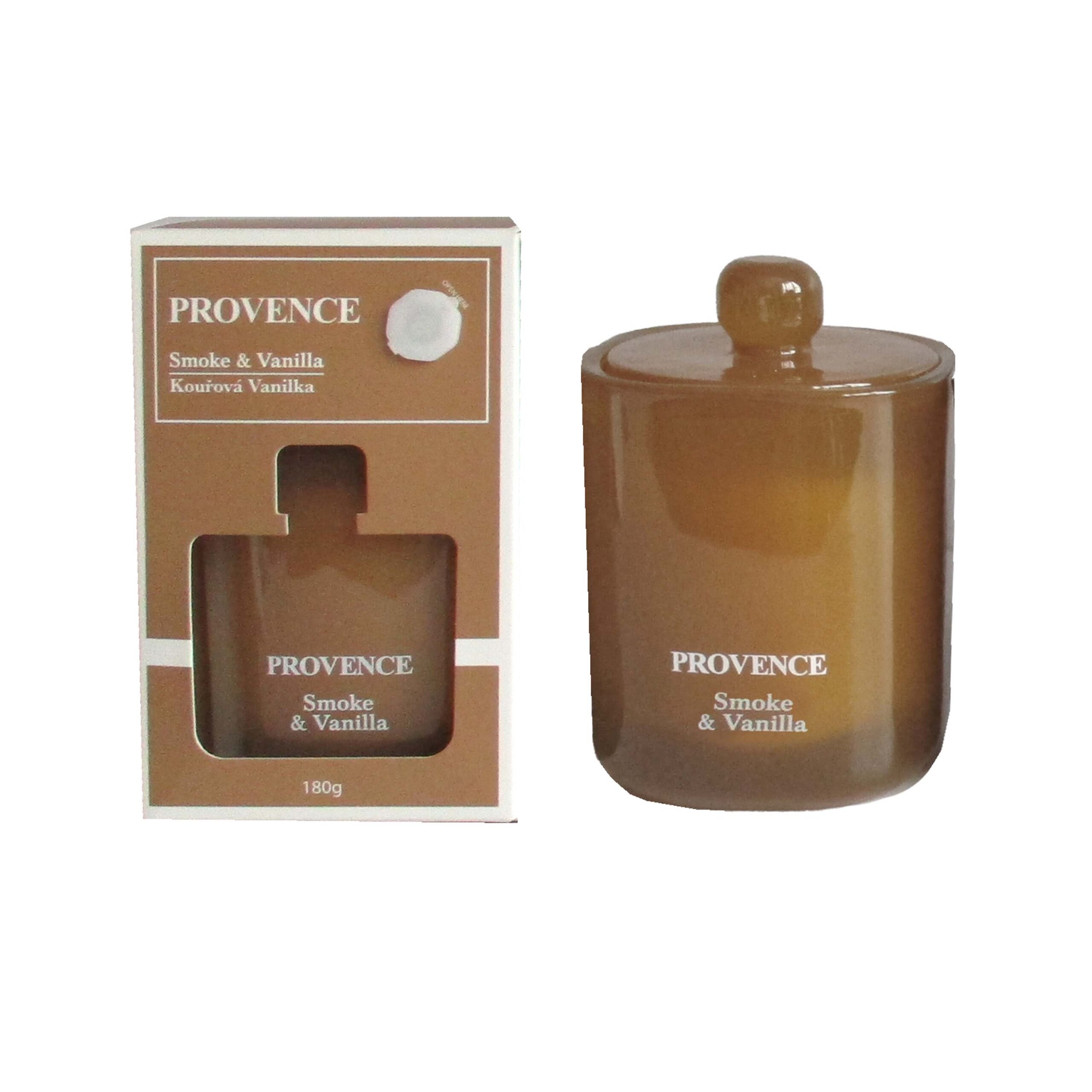 Elegantní vonná svíčka ve skle PROVENCE – Smoke Vanilla nabízí sofistikovanou kombinaci teplých tónů vanilky s nádechem lehkého kouře, která vtáhne každý interiér do atmosféry klidu a jemné mystiky. Vůně „smoke vanilla“ obvykle kombinuje sladkou, krémovou vanilku s kouřovými, dřevitými a někdy i lehce kořenitými tóny. Představte si vůni, kde se sladkost vanilky mísí s teplem a zemitostí doutnajícího dřeva nebo tabáku, což vytváří hřejivý, ale zároveň tajemný a lehce drsný zážitek. skleněný obal působí luxusně a po vyhoření se dá využít jako dekorativní sklenice. Díky hořlavosti až 25 hodin si užijete dlouhotrvající vůni, která je vhodná pro chvíle relaxace nebo zpříjemnění večerní pohody.