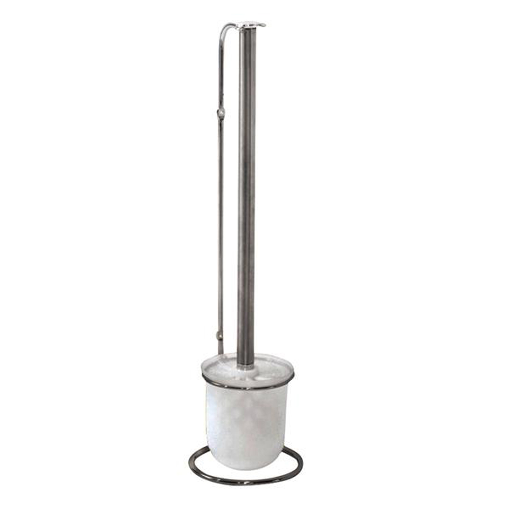 WC souprava na toaletu, štětka s kovovým držadlem v bílé plastové nádobě na kovovém stojánku. Materiál – plast, pochromovaný kov. Rozměry stojanu – 49,7 x 10,5 cm. Rozměry štětky – 47 x 7,8 cm. Barva – modrá, bílá, stříbrná
