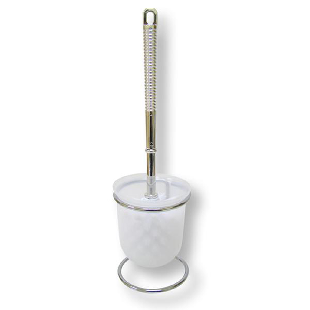 souprava na toaletu – štětka s kovovým držadlem v plastové nádobě na kovovém stojánku. Rozměr stojanu – 13,5 x 10 cm, rozměr štětky – 33 x 8,3 cm. Materiál – plast, pochromovaný kov.